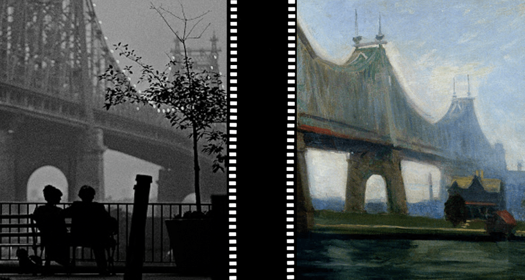 Woody Allen riprende la composizione di Hopper spostando la visione della scena dalla prima persona alla terza, inquadrando se stesso e Diane Keaton di spalle, nell’atto di ammirare il ponte sulla cinquantanovesima strada. Ciò che gioca un ruolo di estrema importanza nell’inquadratura è la fotografia, che si “sostituisce” alla resa cromatica di Hopper, scurendo completamente gli elementi sul piano più vicino allo spettatore, creando delle vere e proprie sagome, immobili e piccole davanti al tripudio di toni di grigio della struttura, vera e propria protagonista del quadro cinematografico.