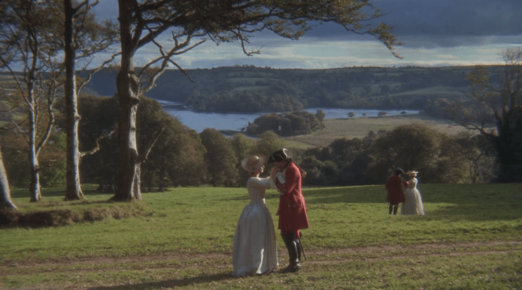 È quindi chiaro che il gusto per il paesaggio e la veduta sono fondamentali in Barry Lyndon. La sua macchina da presa traccia gradualmente un ambiente sempre più enorme, come in un vero e proprio processo pittorico tramite il quale alcune macchie di colore lentamente vanno a formare l’opera definitiva. Proprio sulla base di ciò si può interpretare inoltre la fissità dei personaggi in molte sequenze del film. Dei veri e proprio falsi fermo-immagine nei quali i personaggi sembrano essere letteralmente in posa per un dipinto.
