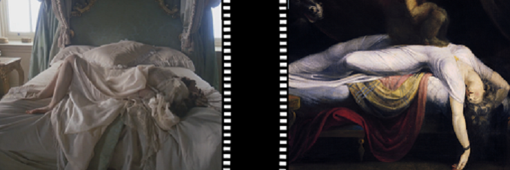Senza addentrarsi inutilmente in interpretazioni relative all’opera non inerenti all’articolo vorrei porre l’attenzione sulla composizione dell’inquadratura e soprattutto dell’opera, che mescola sensazioni neoclassiche (la purezza della veste e il volto classicheggiante di lei) ad altre più cupe e oscure. Così come il bianco lenzuolo e il vestito di Lady Lyndon contrastano fortemente con il suo dolore e le sue urla,allo stesso modo nell’opera di Füssli i colori chiari e scuri si scontrano. Ancora una volta è la luce a definire le forme e i volumi, ad accentuarli e smorzarli, a mostrare e nascondere.