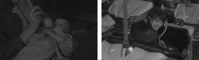 Vittima di tale condizione, la costante crescita del male nei suoi occhi (come dice un’anziana signora che la vita l’ha già vissuta) è un processo irreversibile che ha irrimediabilmente corrotto il suo animo. Bresson mette in contrapposizione i due aspetti della vita di questa povera ragazza: da una parte il suo atteggiamento “adulto” (allatta suo fratello piccolo e si prende cura della madre in fin di vita), dall’altro il suo essere ancora immatura e, in fondo, infantile (cerca di guadagnare qualche soldo per andare a fare un giro sull’autoscontro).