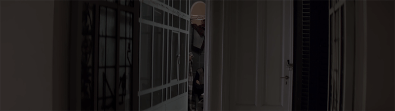 La presenza del regista greco quindi si avverte nell’irrespirabile aria che permea le pareti di una casa all’esterno della quale sembra non esserci nulla (Durán si ostina a non voler uscire fuori da quelle quattro mura se non in una manciata di occasioni): i numerosi specchi e superfici riflettenti portano ad una moltiplicazione dei corpi dei personaggi che, nell’enorme spazio dato dal largo formato, sembrano diventare degli impassibili e impersonali manichini che affollano lo spazio: essi sono freddi, assenti, schiacciati da una rigidità compositiva soffocante, merito di una saggia gestione degli spazi e di una peculiare scelta nel rapporto d’aspetto (Super Ultrawide, ovvero un aspect ratio di 32:9): tale soluzione facilita la disposizione di numerose linee verticali (porte e pareti in primis) e quindi lo schiacciamento delle figure ai lati oppure al centro dell’inquadratura.