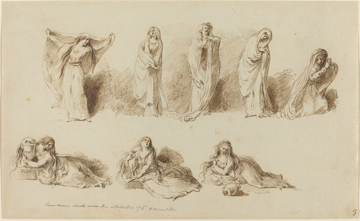 Lady Hamilton non ha una vita lunga quanto quella del Vesuvio o delle sculture dei maestri del passato, eppure di lei rimane l’impronta del tentativo di stare vicino a quelle sculture e di essere tante di esse in più momenti. Proprio come il mezzo cinematografico/fotografico è testimone delle performance degli artisti del XX secolo, così il disegno è testimone della Circe da lei performata o delle numerose ancelle vestite di drappi che sarebbero potute essere scolpite Fidia in persona. La produzione neoclassica di questo cinema è proprio quella di un gesto atto a creare in più momenti qualcosa che già esiste eppure che è diverso di volta in volta: lo stesso Goethe, davanti al Giudizio Universale della Sistina, apre e chiude gli occhi più volte, ricreando un’immagine sempre nitida. La sua è la ricerca di un esule che intraprende un viaggio al fine di offrire al suo sguardo una dimensione nuova, quella dell’Arcadia tanto ambita e ritrovata nelle movenze di una donna o nelle nubi di un vulcano.