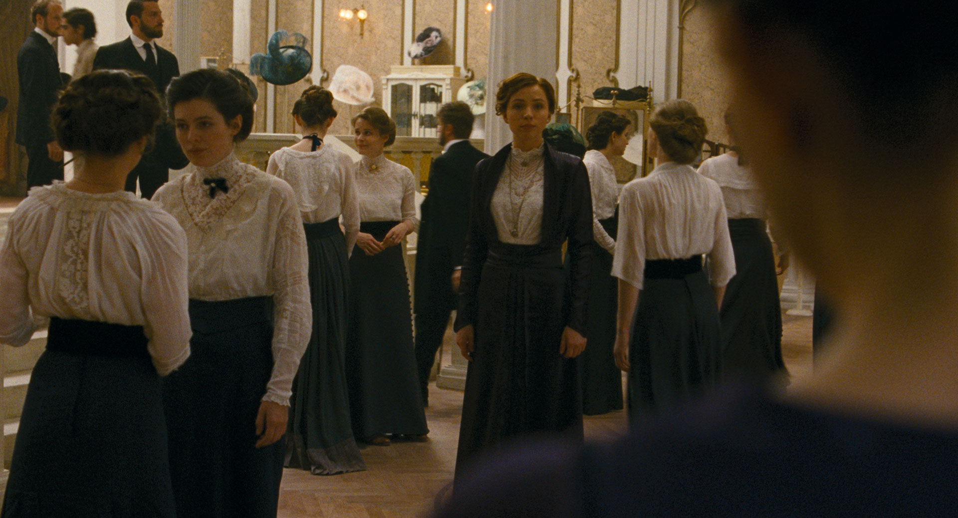 Ancora un passo indietro. Prima che la mdp inquadri un oggetto di interesse e ancor prima che inquadri il volto di lei c’è il primissimo elemento di informazione che viene dato allo spettatore di Tramonto: il suono (quasi sempre addirittura fuori campo). Che sia la voce di un personaggio o il borbottare di un gruppo di rivoluzionari o l’infrangersi di un bicchiere di vetro al suolo, ciò che arriva per primo alle orecchie di Írisz è il suono di qualcosa.