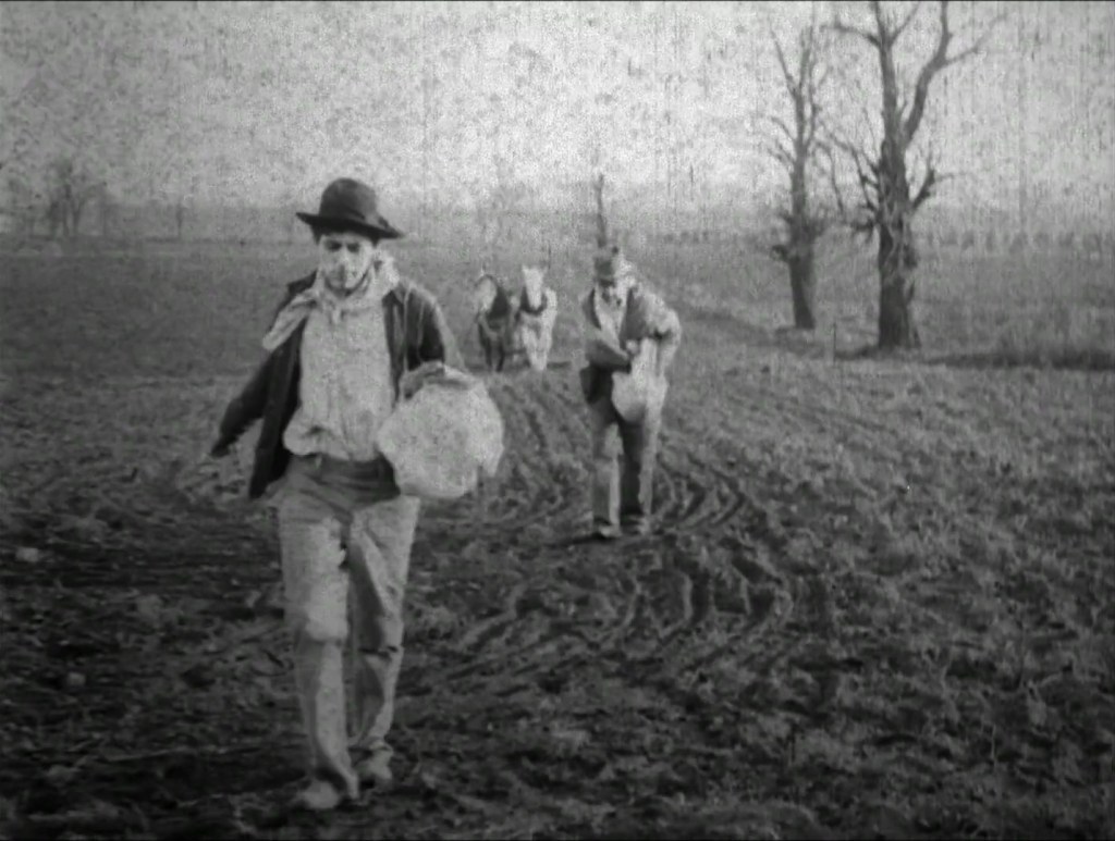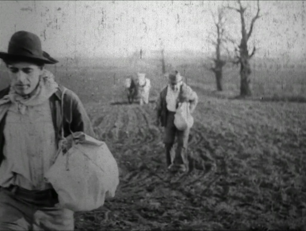Da considerare, in conclusione, la scomposizione in due diversi tableaux vivants della sequenza dei seminatori. È chiaro che questo cinema non faccia riferimento ad un soggetto pittorico in maniera passiva, limitandosi ad una pedissequa messa in scena di una composizione ottocentesca: al contrario, lo assorbe e lo disloca in due momenti distanti a livello narrativo-temporale dando così loro differenti accezioni sulla base della relazione che hanno con tutto il resto della narrazione. Ne consegue che il seminatore della seconda inquadratura vive in un umore nettamente diverso da quello della sequenza di chiusura pur muovendosi in un dipinto vivente formalmente identico. Così il cinema inizia a lavorare nel suo rapporto con la pittura e con una chiara distanza linguistica che non deve essere abolita o ridotta quanto accentuata nella maniera più plateale, a ricordare l’autonomia di un mezzo e delle sue specificità.