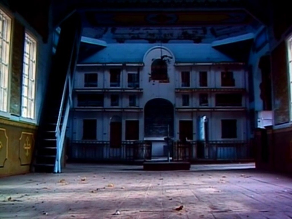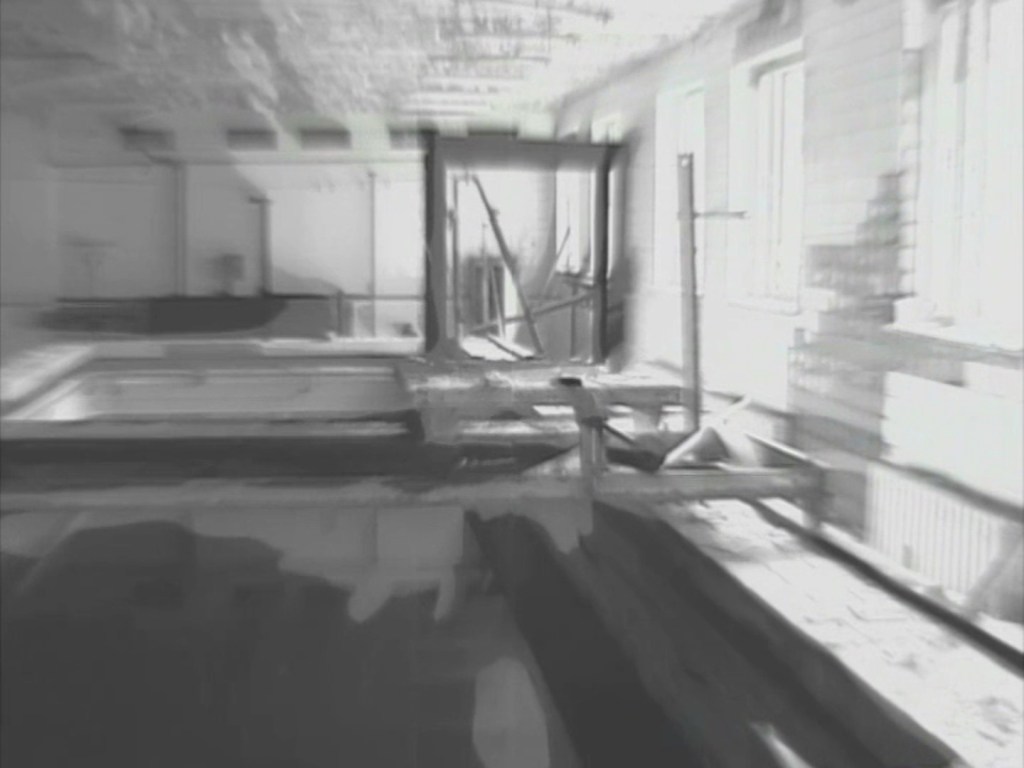 Non ci sono uomini nella Zona d’alienazione né si vedono animali nelle 4 inquadrature che compongono il film, eppure c’è un tremolio angosciante dell’aria, quasi come se le sua particelle fossero inquiete (soprattutto nell’inquadratura del ginnasio); come se l’erosione degli oggetti non bastasse c’è qualcosa che è distorto in quello che vede la macchina da presa, colori anomali, un bianco che gradualmente si spalma sull’ultima inquadratura3 fino a distruggerla.