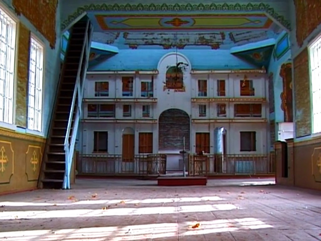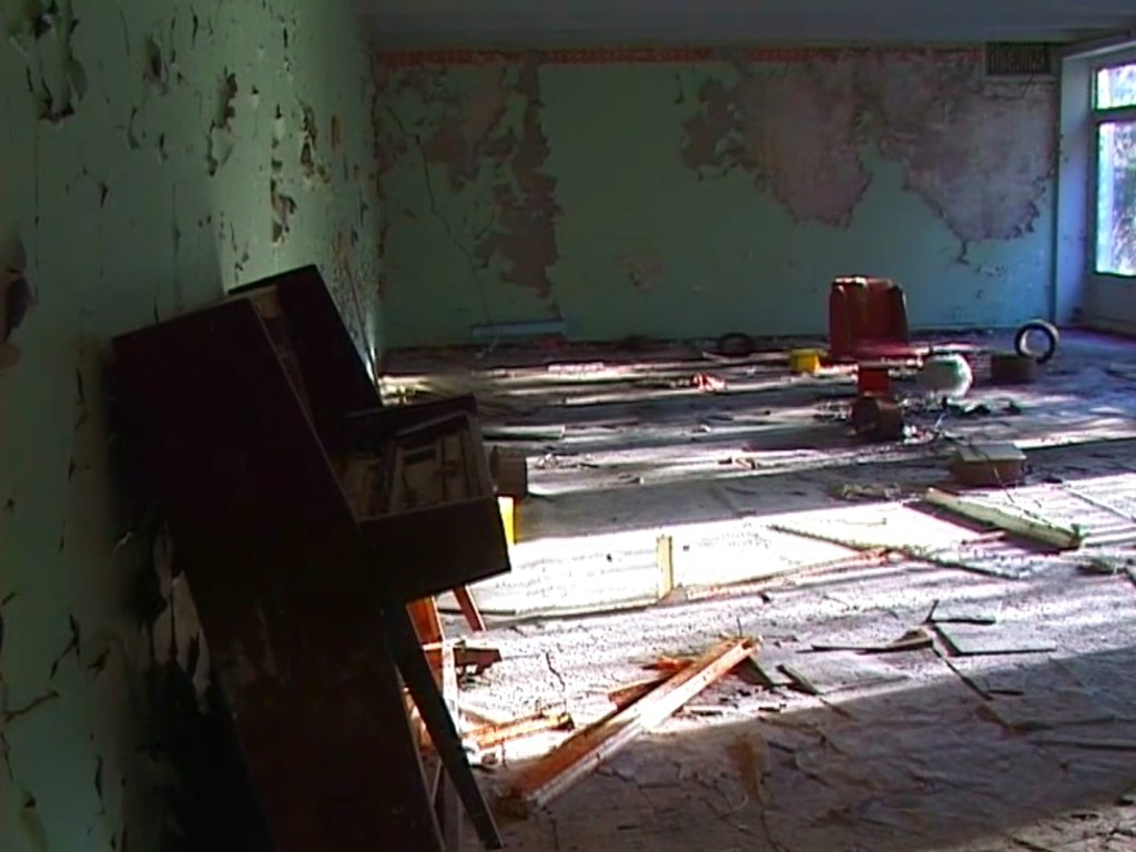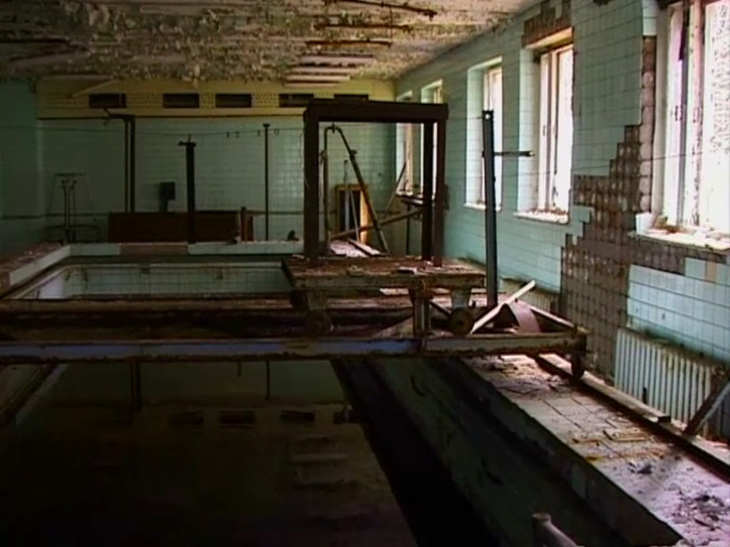 Ciò che invece è essenziale in Aion è proprio il rapporto tra suono e spazio di uno specifico suono in uno specifico spazio. Kirkegaard registra e filma nella Zona di alienazione attorno a Černobyl’ in una chiesa, una palestra, un auditorium e una piscina, nel silenzio di uno spazio che è inaccessibile e quasi totalmente disabitato da decenni. Il silenzio della Zona è diverso dagli altri silenzi, porta con sé l’evidente assenza di un enorme gruppo di umani e delle loro vite, siano esse aggrappate al suono delle campane di una chiesa o alle attrezzature di una palestra o all’acqua di una piscina. Il silenzio di Černobyl’ è un silenzio tangibile e non astratto (come quello di Lucier), è il silenzio di qualcosa che c’era e ora non c’è più, il silenzio di un luogo che non ammette rumori artificiali, diretti o indiretti che siano.