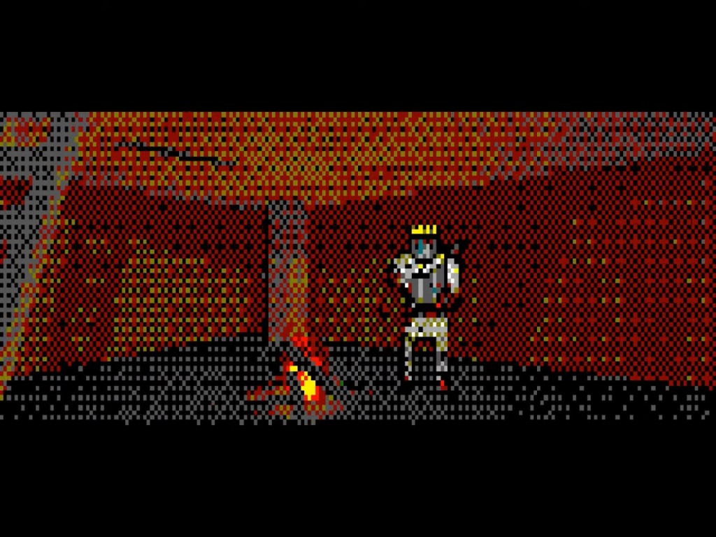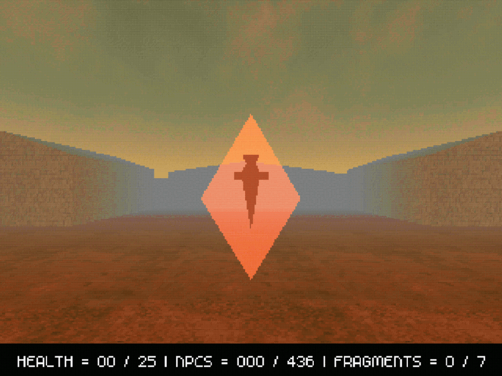 Il secondo finale rilevante è quello più difficile da ottenere e connette inaspettatamente l’opera alla Trilogia PAGAN7. L’accumulo di violenza generata dal personaggio/fruitore nelle diverse aree della città accresce un qualche valore parametrico legato probabilmente alla follia, all’annichilimento, all’acuirsi della sua tendenza (auto)distruttiva – dunque suicida: questo porta alla comparsa di alcune figure demoniache nella mappa (virtualmente impossibili da fronteggiare) che colonizzano gli spazi della Sigil Town. In questo contesto – si direbbe apocalittico, non fosse per il fatto che, dopotutto, è di un minuscolo uomo che si parla –, trovarsi al momento giusto e nel posto giusto dà accesso all’ultimo finale, strepitoso nella sua natura meta- e inter- mediale: il videogiocatore si ritrova catapultato in Your Child Looking West (è davvero così? Oppure, forse, è solo una visione/ricordo pre-morte del protagonista poco prima del suo suicidio? O dopo?), l’opera di XENOS Softworks di cui si ha la fortuna di possedere qualche informazione e che sembrava essere perduta per sempre8. Qui egli dovrà recuperare i frammenti della mitica Excalibur – altro oggetto presente in tutte le opere di Garden – per poterla forgiare nuovamente.