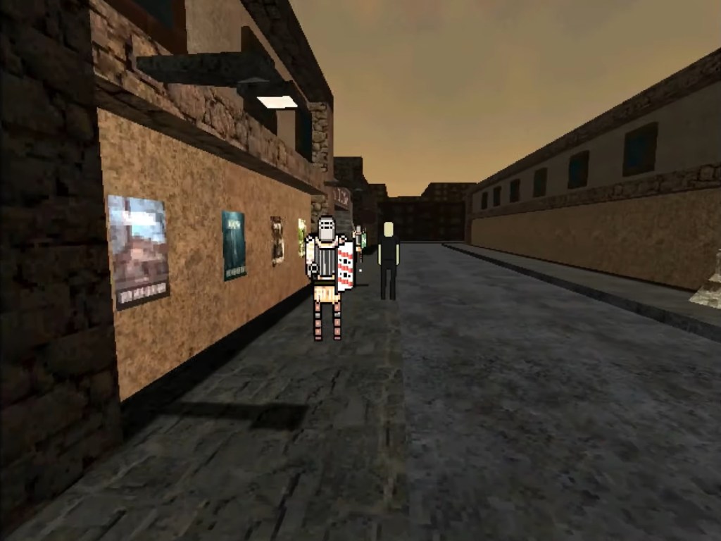 HEXCRAFT: Eventide Sigil è un’opera estremamente difficile da qualunque punto di vista la si voglia approcciare: richiede un’abilità performativa non indifferente da parte del fruitore e non ha problemi a punirlo duramente qualora esso non fosse disposto a migliorare (la morte è permanente – vale a dire che il software si spegne al termine della breve sequenza del primo finale). L’emozione globale che ammanta tutta l’opera è probabilmente quella di una tensione angosciosa sempre sul punto di oltrepassare il limite della sopportazione: tutto è silenzioso, tutto sembra preludere ad un disastro, anche le più banali soluzioni tecniche puntano all’inquietudine di un fruitore che sa di avere tra le mani il controllo di un finto crociato. A quest’ultimo proposito si menziona, a titolo d’esempio, la scelta di impostare un’asse fisso alle sagome dei personaggi non giocabili: i cavalieri, le forze dell’ordine ma soprattutto i cittadini, figurette identiche tra loro e prive di volto, ruotano su sé stesse mantenendo costantemente il loro corpo rivolto verso il personaggio; non si può girare loro attorno, non si può passare inosservati. Questi ultimi, inoltre, vittime principali del massacro, invano tenteranno di scappare davanti alla manifesta intenzione – da parte del videogiocatore – di ucciderli: si accumuleranno tendenzialmente agli angoli delle stanze, oscilleranno inutilmente da una parte all’altra del campo visivo, proveranno a scappare per le vie principali della città. Tutto ciò tenendo sempre il loro corpo rivolto verso il carnefice, senza emanare alcun suono né strepitio. Il vero “suono” di HES è quello dello sparo dell’arma da fuoco. All’arrivo della polizia la paura si fa tangibile e la consapevolezza della morte permanente imposta dal videogioco basta e avanza a rendere qualche manciata di minuti un vero e proprio incubo.