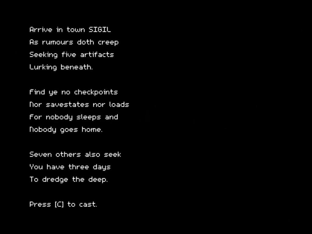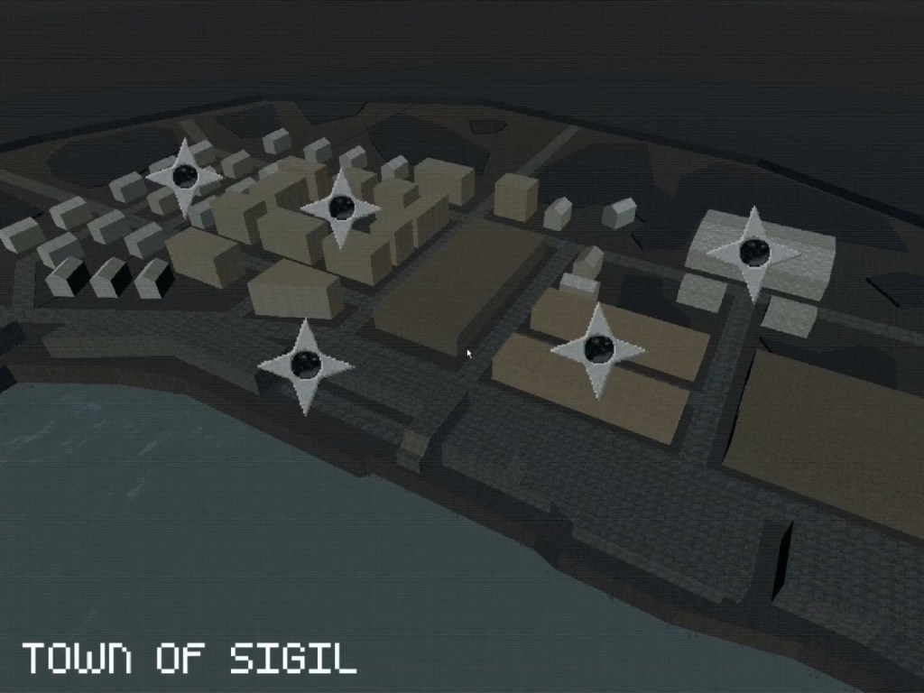 È interessante a tal proposito che il processo di identificazione primaria (che, a differenza del cinema, nel videogioco coincide con quello di identificazione secondaria – perlomeno nei confronti del protagonista) sortisca un effetto opposto rispetto a quello generato dalla Trilogia PAGAN (cui HES è intimamente legato – si vedrà più avanti in che modo): se in quel caso la visuale in prima persona garantiva il potenziamento dell’immersione all’interno del punto di vista di una figura in cammino verso un nuovo corpo e una nuova vita, qui ci si trova dall’altra parte dello spettro: il protagonista va quasi sicuramente verso la (auto)distruzione data da un gesto che non può moralmente implicare o accettare qualsivoglia forma di riscatto. Il videogiocatore non vuole stare al gioco eppure è costretto dal sistema narrativo – impositivo – a portare a termine il suo percorso nella Sigil Town alla ricerca di 5 misteriose reliquie3.