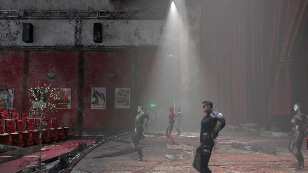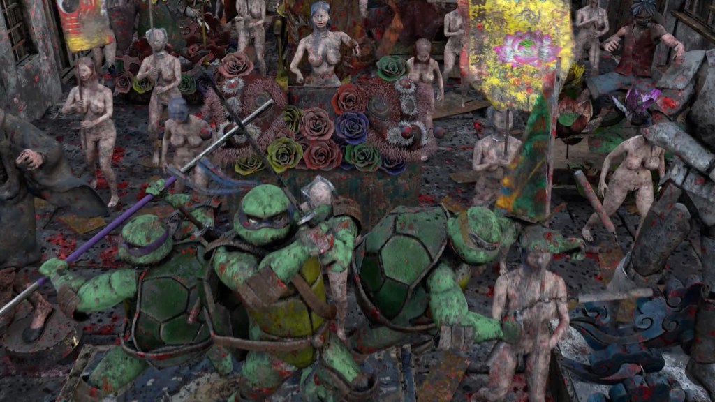 L’unico movimento di macchina di 8’28”, un carrello all’indietro, dischiude gradualmente una serie di micro-situazioni, mettendo in prospettiva le precedenti e costruendo una tensione crescente per le successive (ignote). Questo mondo che viene fuori è una fiera del sangue coagulato, una parata di dèi insozzati e si badi bene che divinità, oggi, non è solo Gesù Cristo o Ganesha; di fianco a questi carri allegorici tradizionali sfilano le Tartarughe Ninja e uno Stormtrooper, perché in uno dei momenti storici spiritualmente più poveri dell’umanità (se non il più povero in assoluto) anche Iron Man può essere dio, e dunque può, insieme ai suoi colleghi supereroi, ballare come un idiota sul palco di un teatro al collasso per il giubilo di una platea completamente assente (sia essa vuota – come in questo caso – oppure no). Forse è solo facendo collassare la sala che si può sperare in un fiorire.