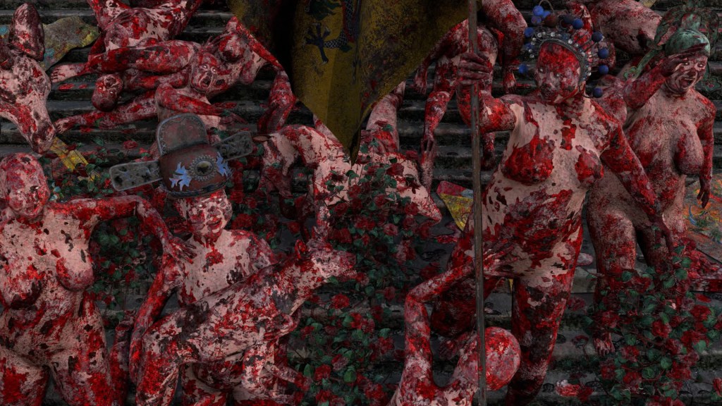 Nemmeno l’arte si salva, qui: capanni di dipinti accatastati e incrostati di sangue sono lasciati a sé stessi o, appunto, usati come ornati di marchingegni di morte; e, come se non bastasse, una delle opere più alte dell’ingegno umano e dell’idea stessa di antropocentrismo/umanesimo/rinascimento, l’Ultima Cena di Leonardo, è ambiente che ospita un banchetto di ossa e corpi mutilati, una cena ultima nel vero senso della parola.